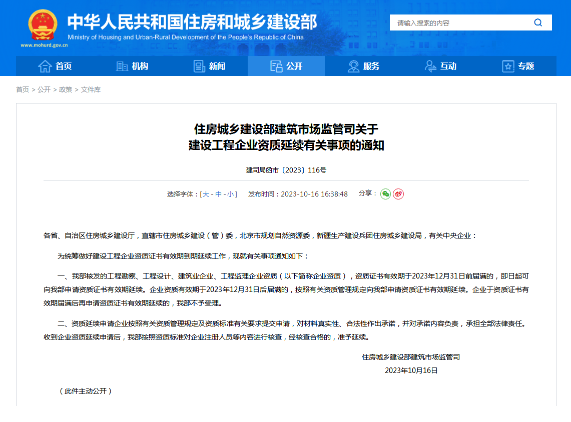 一、我部核發(fā)的工程勘察、工程設(shè)計(jì)、建筑業(yè)企業(yè)、工程監(jiān)理企業(yè)資質(zhì)(以下簡(jiǎn)稱企業(yè)資質(zhì)),資質(zhì)證書(shū)有效期于2023年12月31日前屆滿的,即日起可向我部申請(qǐng)資質(zhì)證書(shū)有效期延續(xù)。企業(yè)資質(zhì)有效期于2023年12月31日后屆滿的,按照有關(guān)資質(zhì)管理規(guī)定向我部申請(qǐng)資質(zhì)證書(shū)有效期延續(xù)。企業(yè)于資質(zhì)證書(shū)有效期屆滿后再申請(qǐng)資質(zhì)證書(shū)有效期延續(xù)的,我部不予受理。