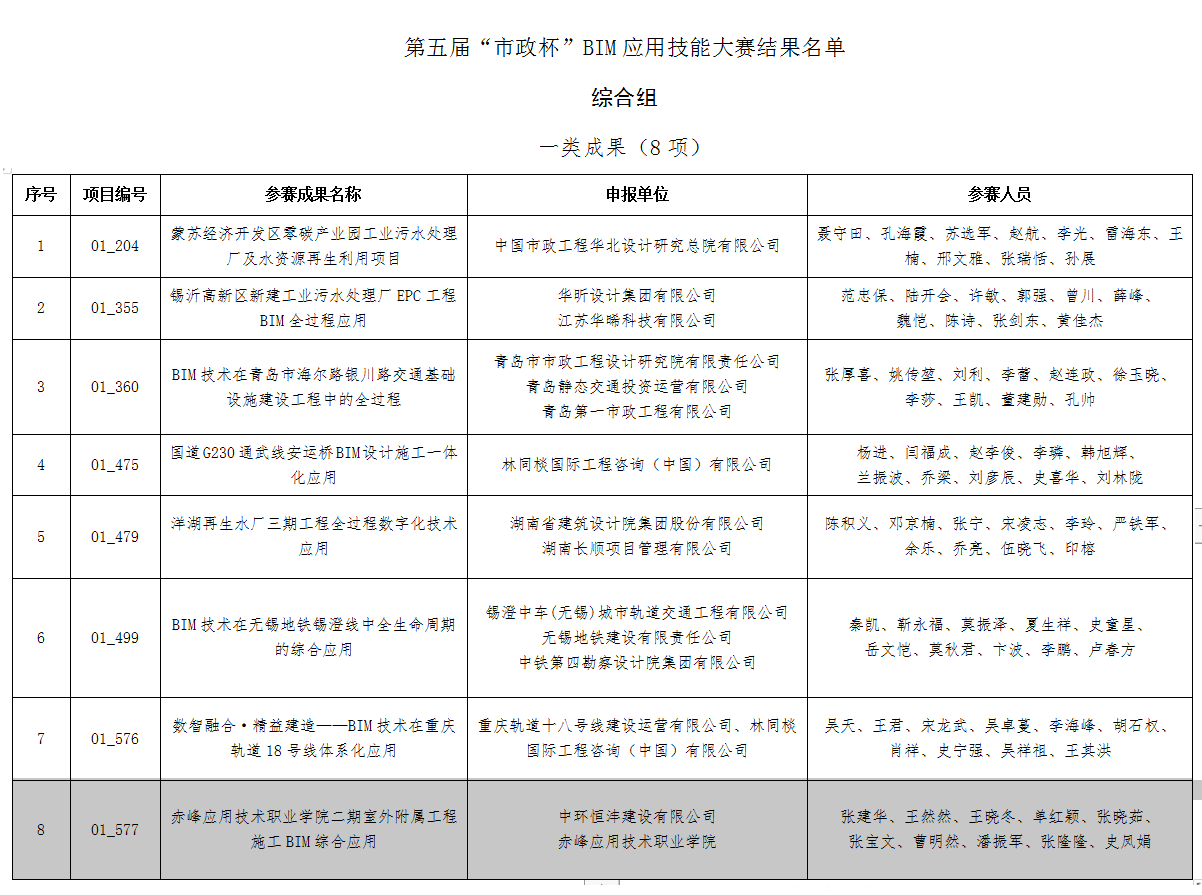 根據(jù)中國市政工程協(xié)會“市政杯”BIM應用技能大賽評選(試行)辦法,大賽本著公平、公正和科學的原則,認真履行規(guī)定的程序。經(jīng)過專家評審、答辯和公示,最終從575項(綜合組105項、設計組79項、施工組357項、研發(fā)與數(shù)字孿生組34項)評選出260項成果分別取得一類成果、二類成果、三類成果、優(yōu)秀成果。取得一類成果的團隊成員同時取得個人優(yōu)秀創(chuàng)新成果。中環(huán)恒灃建設有限公司“赤峰應用技術(shù)職業(yè)學院二期室外附屬工程施工BIM綜合應用”獲綜合組一類成果。參賽人張建華、王然然、王曉冬、單紅穎、張曉茹、張寶文、曹明然、潘振軍、張隆隆、史鳳娟獲得個人優(yōu)秀創(chuàng)新成果獎。