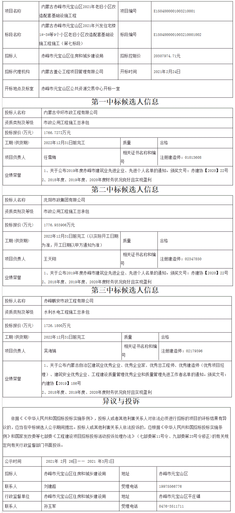 內(nèi)蒙古赤峰市元寶山區(qū)2021年興發(fā)住宅樓1#-3#等9個(gè)小區(qū)老舊小區(qū)改造配套基礎(chǔ)設(shè)施工程施工(第七標(biāo)段)招標(biāo)評(píng)標(biāo)工作已結(jié)束,依據(jù)評(píng)標(biāo)委員會(huì)的評(píng)標(biāo)報(bào)告,發(fā)布中標(biāo)候選人公示如下: